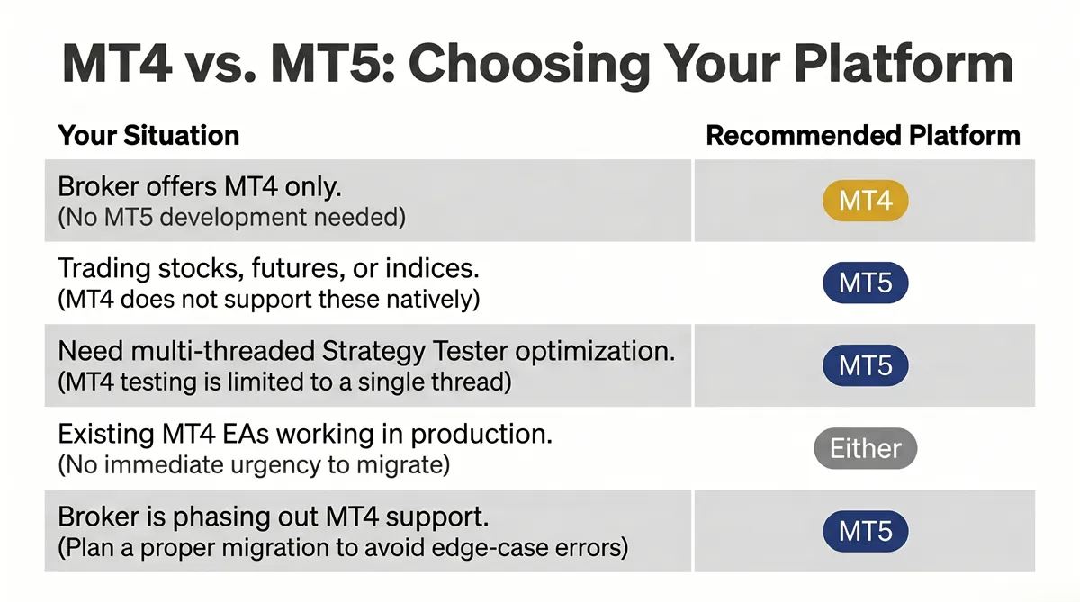 | Broker offers both MT4 and MT5 | MT5 for new projects; MT4 if existing EAs work in production |