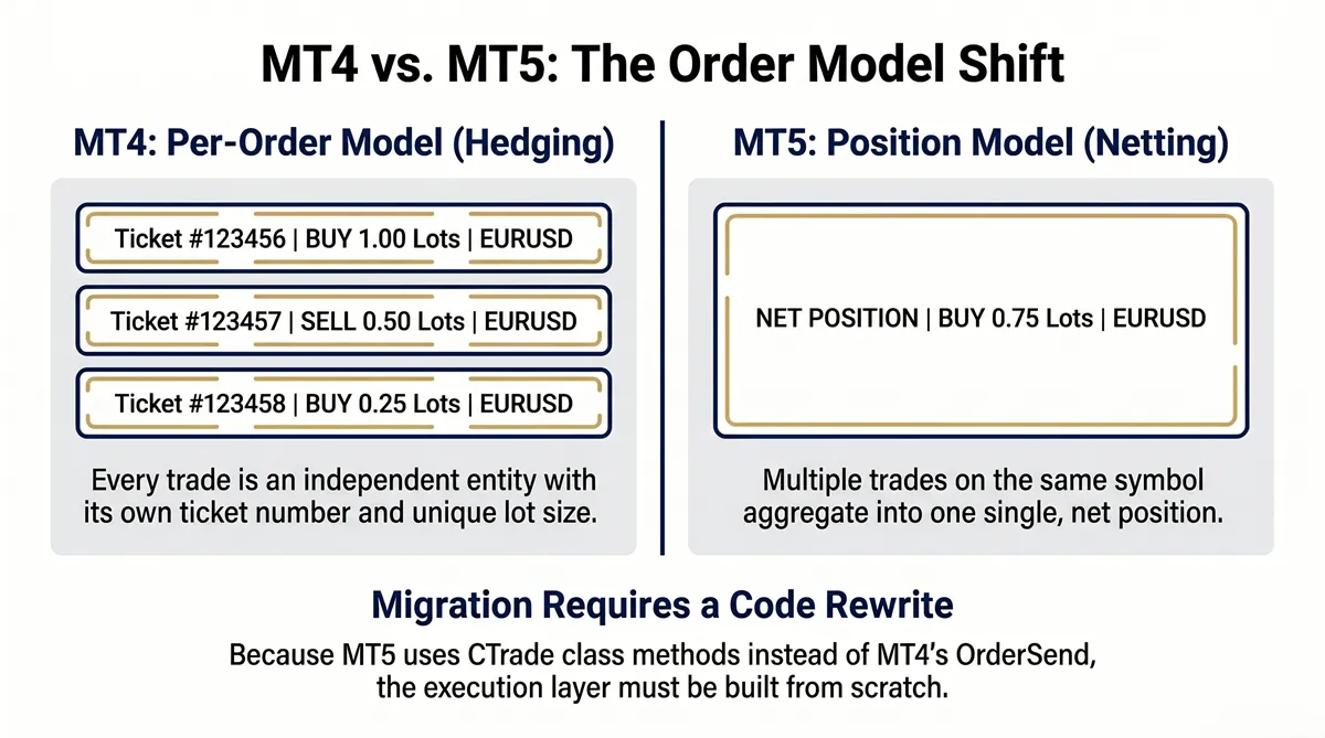 This distinction matters more than most traders expect. An MT4 EA managing a basket of 8 EURUSD entries cannot be rebuilt for MT5 by copying the logic. The position model changes how open trades are identified, modified, and closed. Brokers using netting mode — standard in institutional environments — require fundamentally different order management code than hedging-mode brokers.