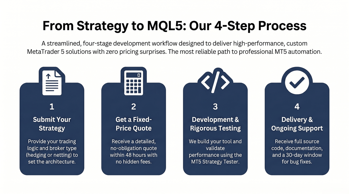 - Submit Your Spec: Describe your trading idea or send an existing strategy document. For MT5 projects, we ask upfront whether your broker uses hedging or netting mode — this determines the entire execution architecture before we write a single line of order management code.