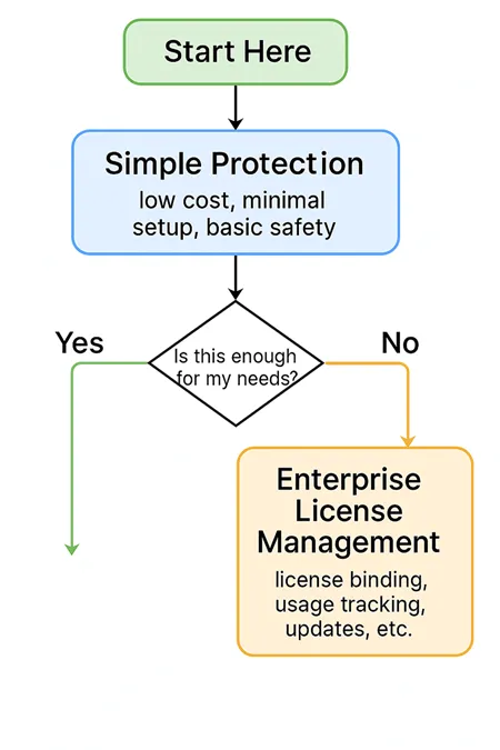 Here’s a decision guide to help you choose between “DIY / simple protection” vs “enterprise license management”: